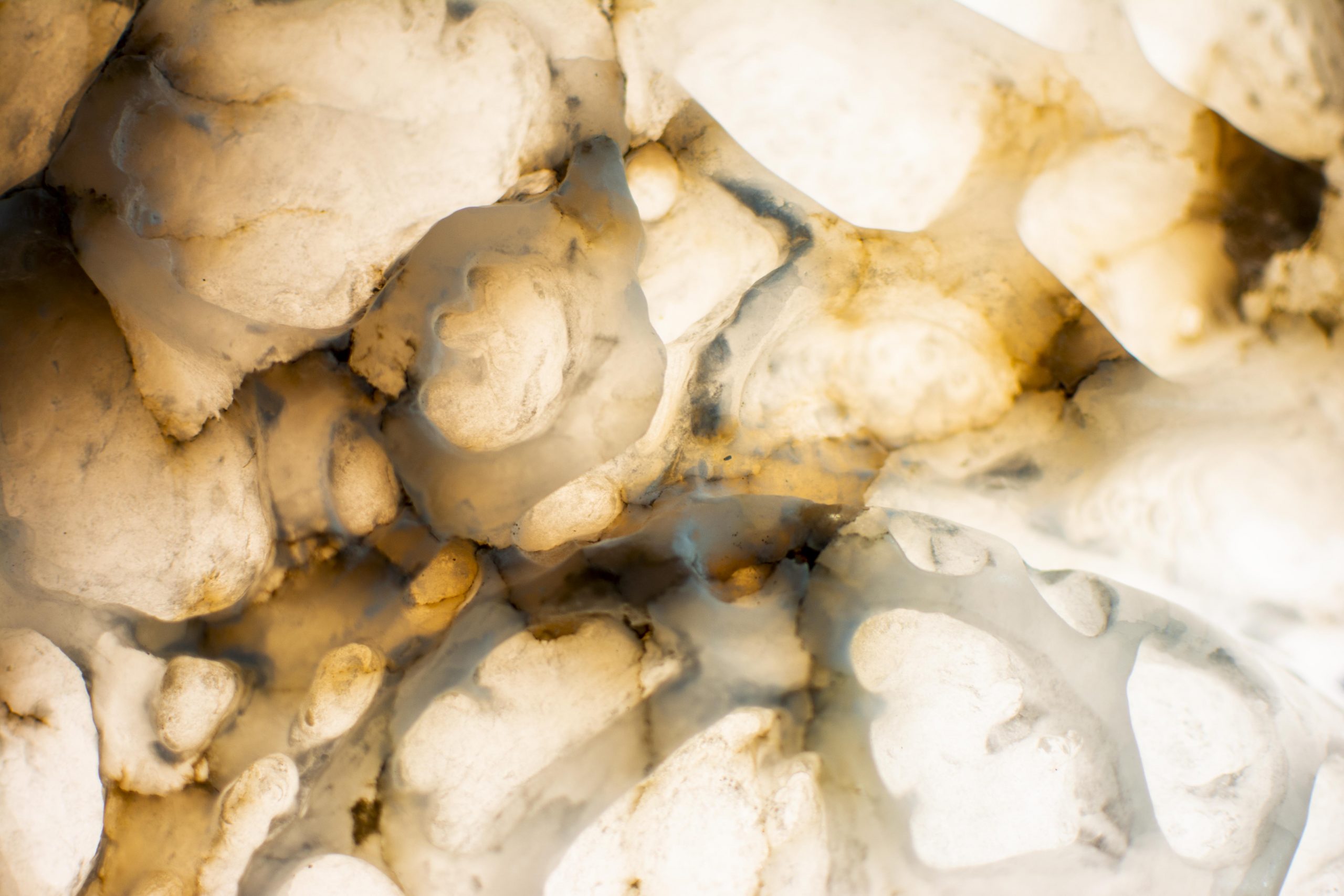 Pollen grains were the great Angiosperm plant innovation to free themselves from water-dependent reproduction and dispersal. Male pollen could fly lightly into the stratosphere and travel huge distances, in this watertight sealed spaceship of hope for the future generation. But over 99% of these pollen grains do not land on the female stigma and perish. It is simply a matter of chance where they land. Also, the exact simultaneous timing of the launch of the pollen and the availability of the receptive female gynoecium is critical. They both have to be ready at the same time. The less than 1% of the pollens that do survive and fertilize the gynoecium have thus travelled against extreme odds. This sculpture shows the structural variety of four types of flower pollen grains.
